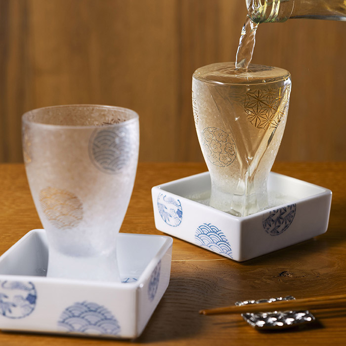 ・プレミアムニッポンテイストシリーズの代表的な柄である「桜」「丸紋」「鳥獣戯画」「花火」で、新たにユニークな”こぼし酒”アイテムが誕生しました。 ・受け皿用の小付けは伝統的な美濃焼の染付(磁器製)で、硝子との組み合わせが新鮮でモダンな日本文化を感じさせます。 古くから伝わる日本独特の所作を、ご自宅で是非お楽しみください。